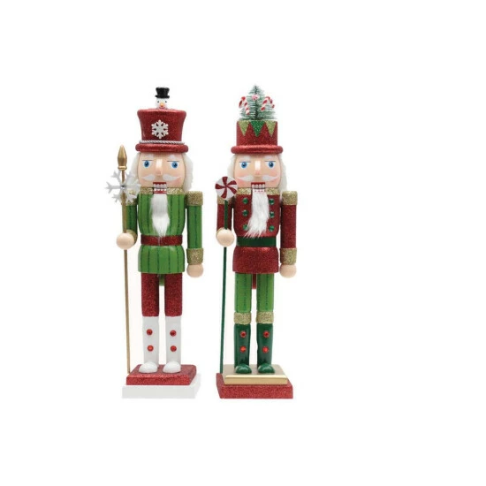 Christmas is a time of magic and fun, when the everyday world is joyfully decorated and becomes a place of beauty, fantasy and grandeur. Sharing in this Christmas magic, these two exquisite nutcrackers are fancifully outfitted in bright and cheerful holiday colors with whimsical headpieces, and carry either a peppermint or snowflake topped staff. Beautifully handcrafted from wood and hand painted, these nutcrackers are sure to provide many seasons of pleasure.