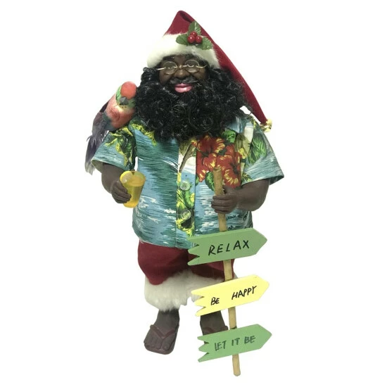 After the Christmas rush is over, Santa heads south, because there aren’t any good beaches at the North Pole and it’s hard to read a book outside when the sun never comes up! He packs his favorite Hawaiian short sleeve shirt; a bottle of his favorite beach beverage and some flip flops then hits the first express out of town. This Santa is enjoying the beach with a friendly parrot on his shoulder and is holding a sign that reads “Relax, Be Happy, Let It Be.” Enjoy the holidays with this handcrafted 15″ Black Beach Claus that is sure to provide many seasons of pleasure. Made of fabric and resin.