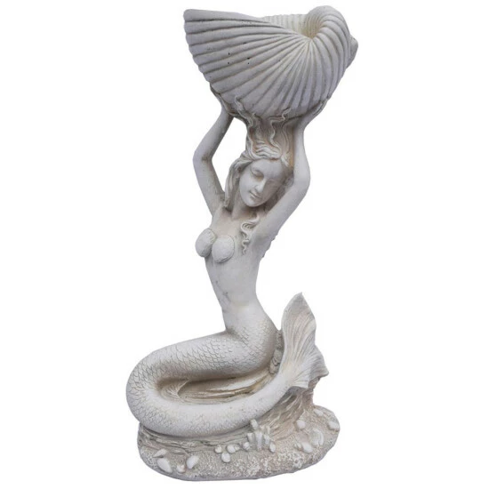 Dreamy mermaid holding up a shell bath for birds. Cold cast resin to provide many seasons of pleasure.
